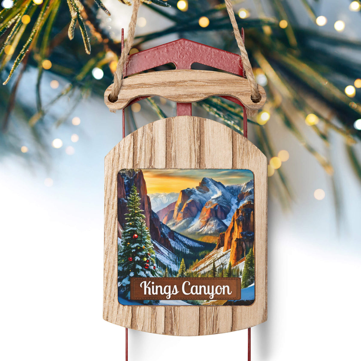 Capture the majestic beauty of Kings Canyon National Park with this one-of-a-kind keepsake wood Christmas sled ornament with red metal runners. Featuring a festive version of the park's breathtaking landscape, this ornament showcases a serene winter scene with towering canyon walls, lush evergreen trees, and a beautifully decorated Christmas tree. Perfect for nature lovers and park enthusiasts, it serves as a beautiful reminder of the cherished moments spent in this national treasure.